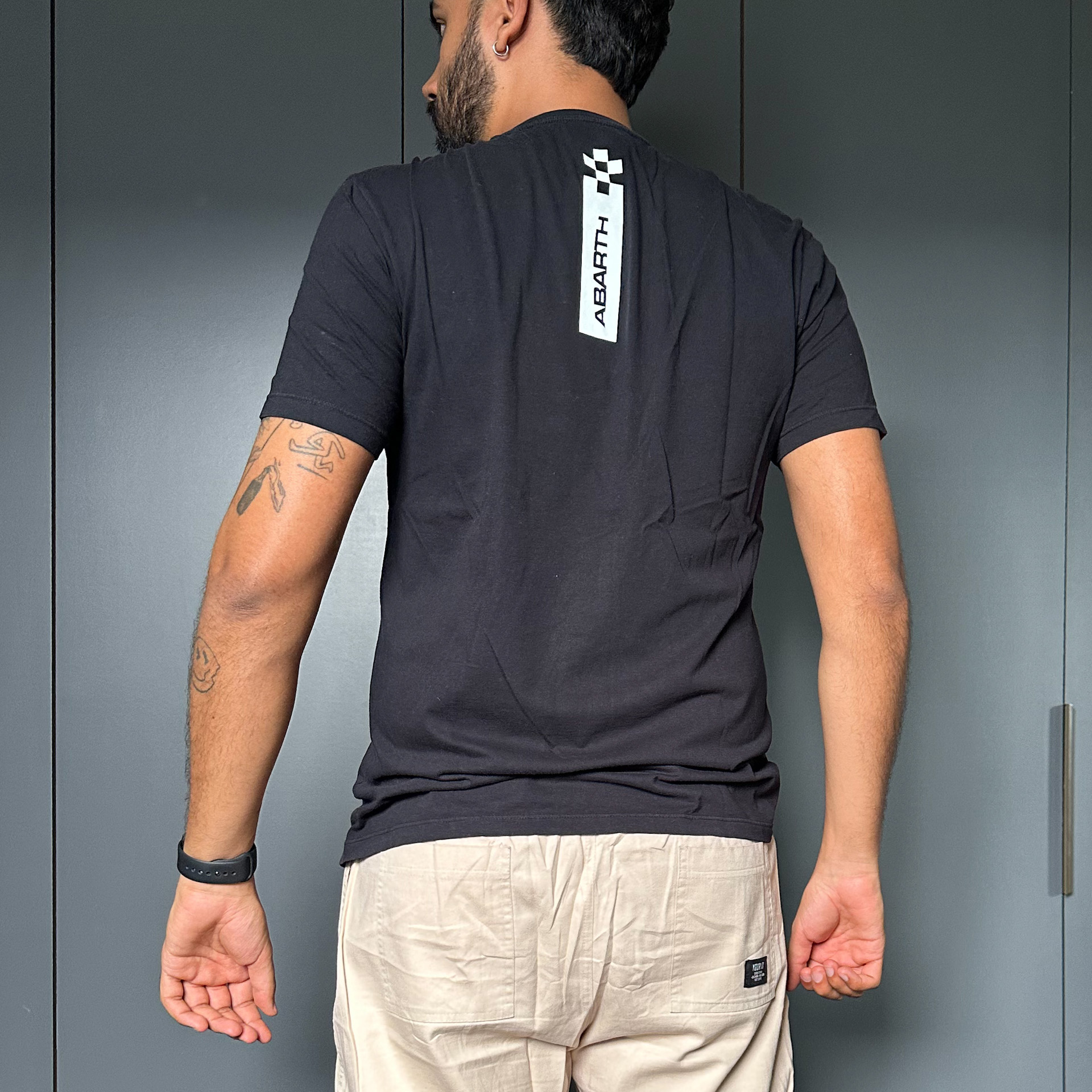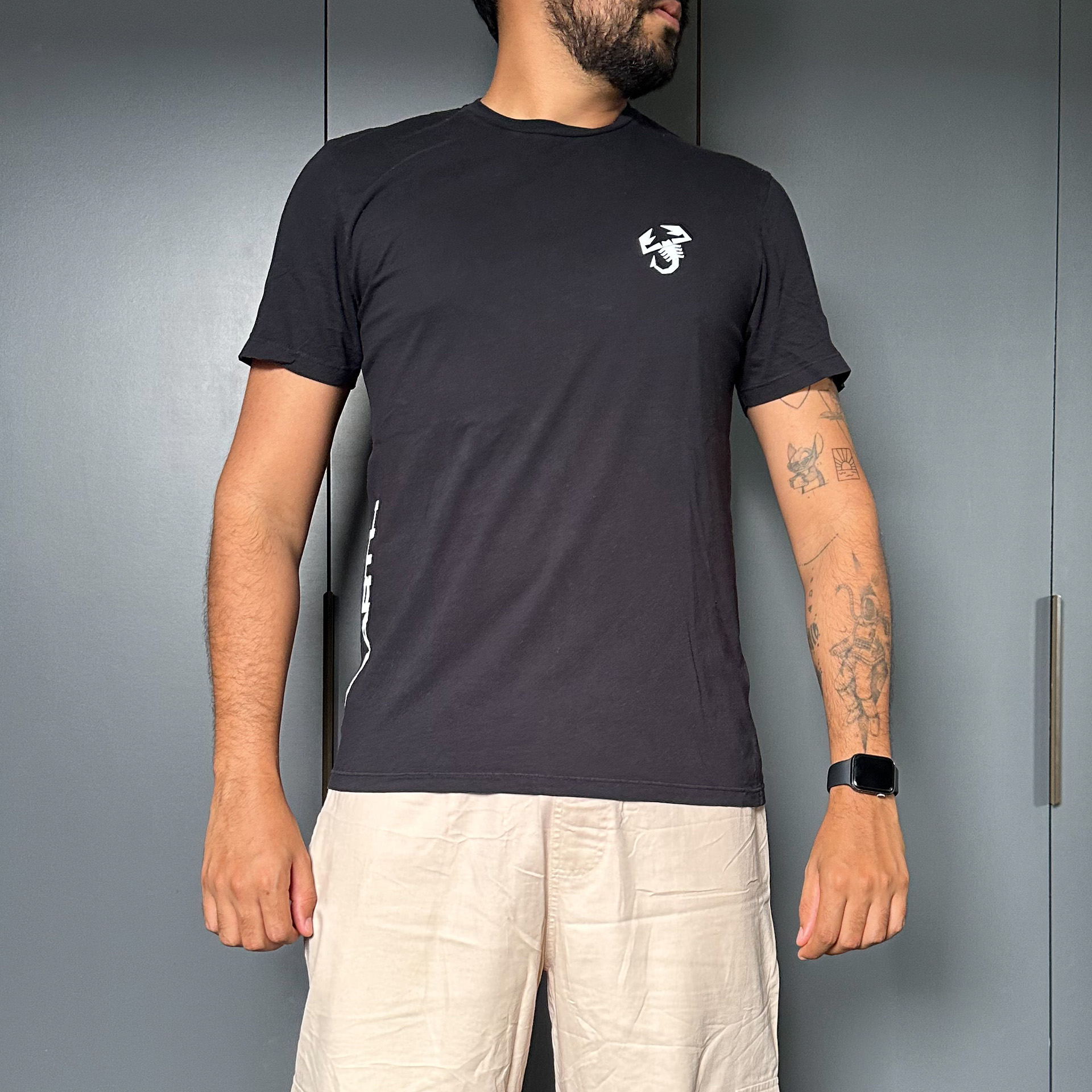 Camiseta preta com estampa da Abarth. Modelagem tradicional.