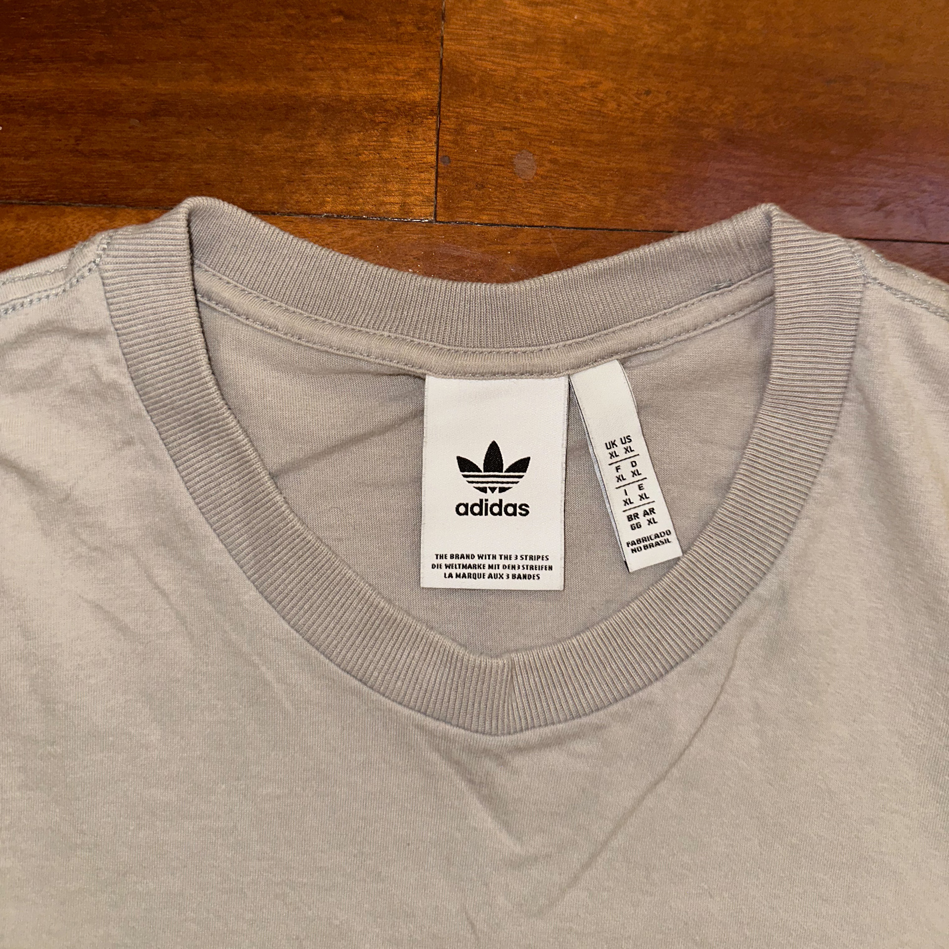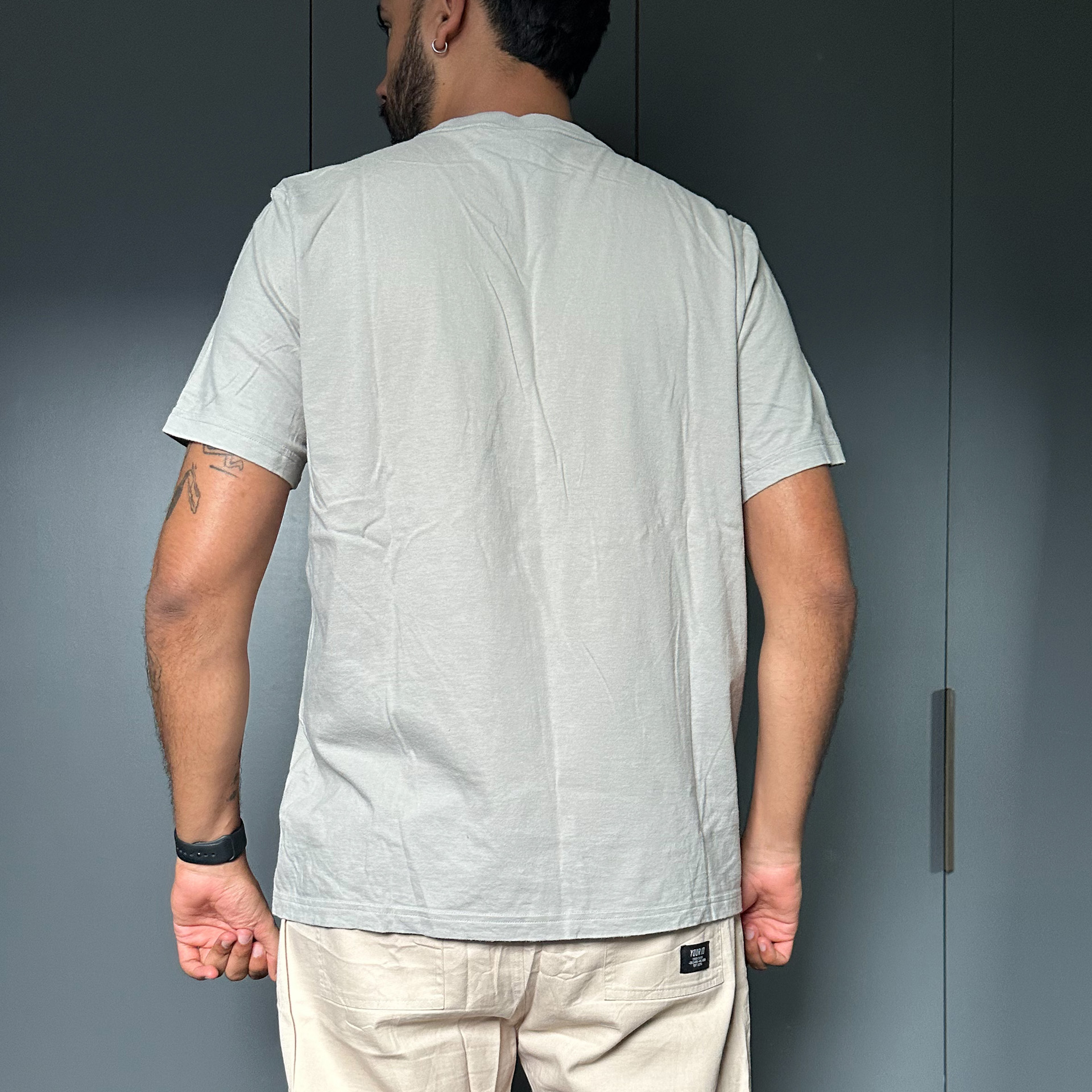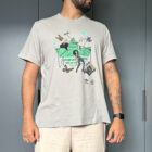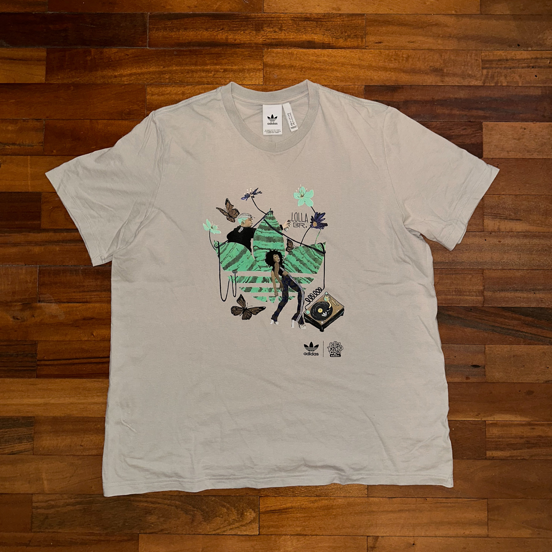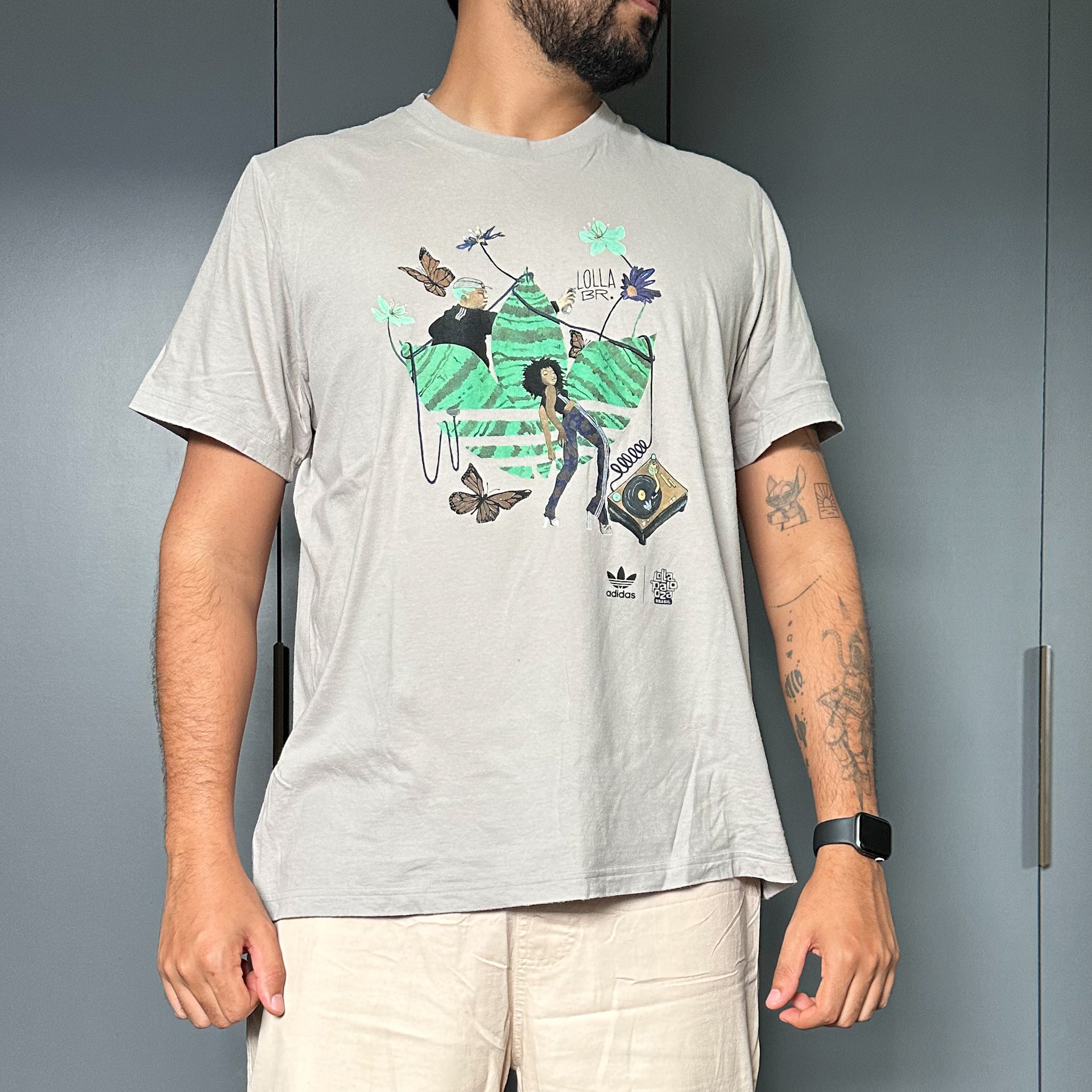 Camiseta da colaboração Adidas e Lollapalloza Brasil. Cor cinza com estampa colorida verde na frente.