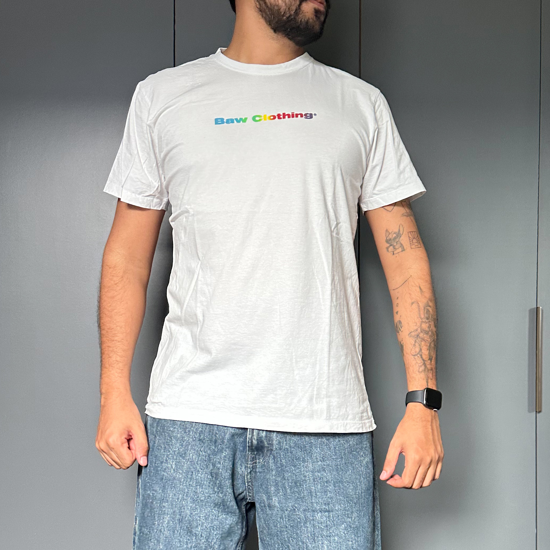 Camiseta básica com estampa colorida da Baw. Modelagem tradicional.