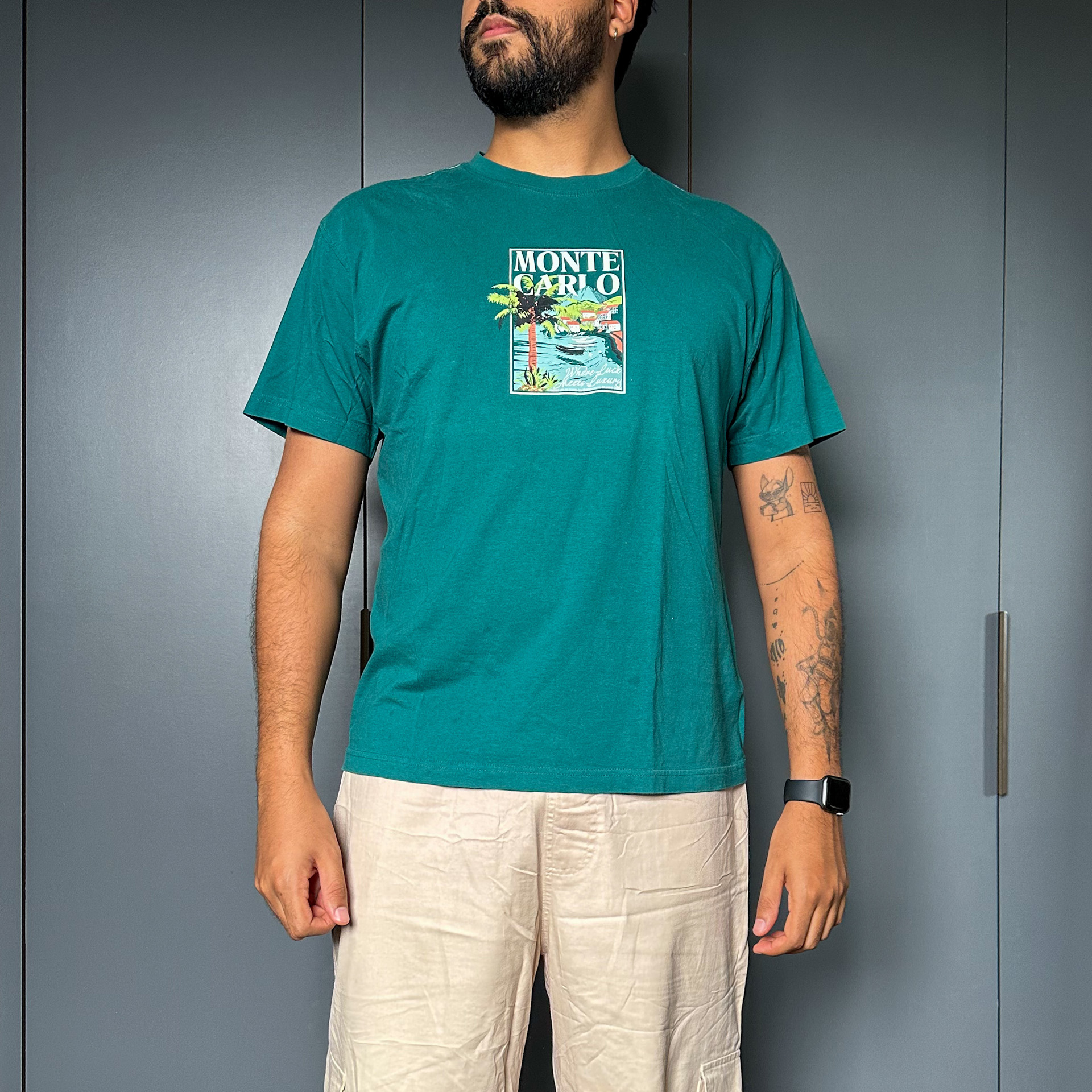 Camiseta básica com estampa de Monte Carlo da Cotton On. Cor verde com estampa colorida na frente.